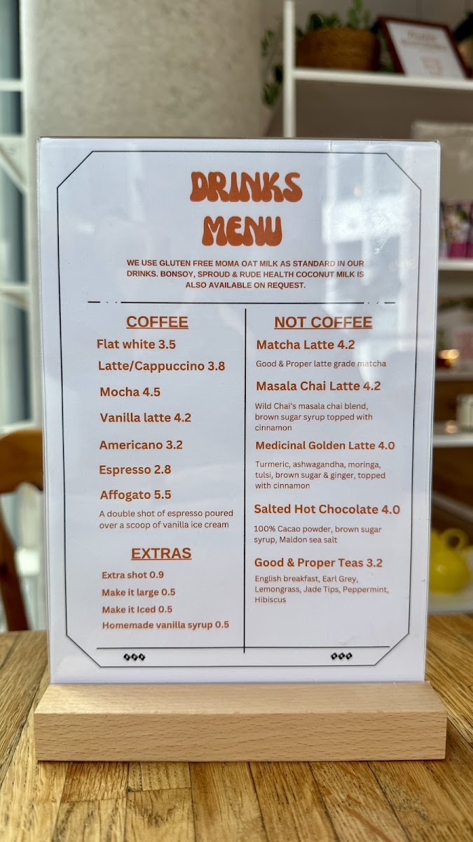 The menu is designed for casual dining occasions where visitors can choose from quick orders of drinks and snacks or opt for fuller vegan meals. The range supports varied dietary preferences within the vegan category and includes both sweet and savory items.